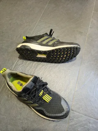 Zapatillas de running Adidas Adizero Boston. - Color: Morado y verde. - Modelo: Adizero Boston 10. No tiene etiquetas, si conservo la caja y el ticket de compra de diciembre Uso 44 y me van un poco cortas, lo justo para que me molesten. Probadas una vez en pista, me molestan.