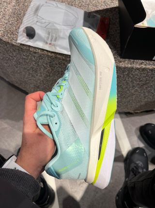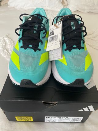 Zapatillas Adidas Adios Pro 4 en tonos azules y verdes. Número 45.5, no se pueden devolver y no me valen Me habéis preguntado bastante, en la última foto adjunto etiqueta de la zapatilla.