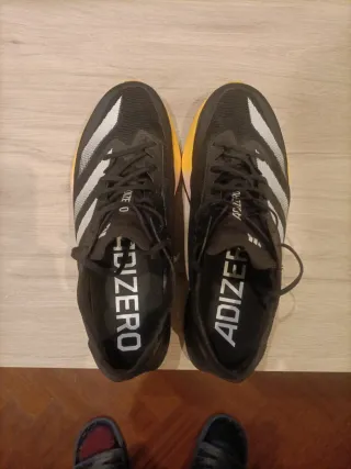 Zapatilla deportiva de alto rendimiento. Las he usado muy pocas veces, 3 simulacros contados pero me regalaron el modelo superior y ya no las uso. Talla 47 1/3 - Modelo Adizero Adios Pro 3. - Diseño en negro con detalles en rosa y amarillo. Nuevas cuestan 250