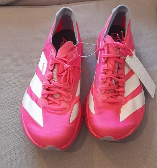 Zapatillas de running Adidas Adizero Adios Pro 4 en llamativo color rosa con detalles blancos. Diseñadas para ofrecer un rendimiento excepcional. - Nuevas a estrenar . Talla 44.5