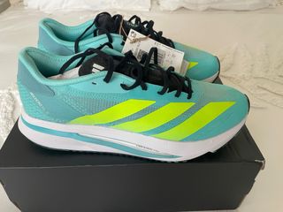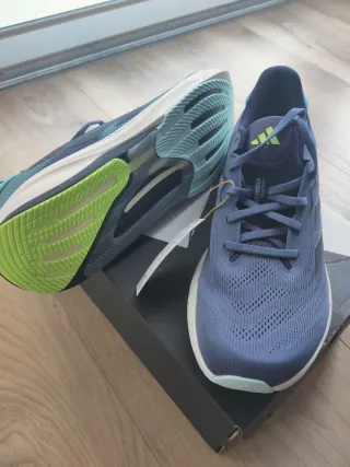 Zapatillas de running Adidas Adizero Boston 13 Mujeres 39 (1/3) en tonos verdes y azulados. Vendo las zapatillas porque me quedan un poco pequeñas. Solo las he usado en dos entrenamientos con un total de 15 km - Diseño ligero y transpirable. - Suela con tecnología Lightstrike Pro. - Detalles de tres rayas icónicas de Adidas.