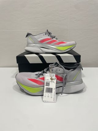 Zapatillas de running Adidas Adizero Boston 12 para mujer. zapatillas con placa de carbono en su caja original. precio nuevas en tienda 160€ - Color gris con detalles en rosa y lima. - Diseño ligero y transpirable. - Suela con amortiguación. - Cierre de cordones.