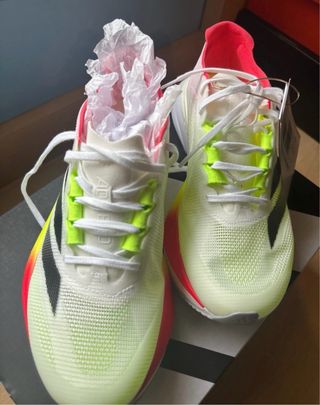 Color amarillo volt (brillan como si fuesen turboalimentadas). 🌟 Estado: A estrenar, nuevas con etiqueta. 👟 Modelo tope de gama de adidas para velocidad y larga distancia. 📦 Precio oficial: 300€ aprox. 👍 Entrega rápida y bien embalado. 🔥 Características destacadas Upper STRUNG ultraligero y adaptable (comodidad real). Doble placa de carbono + mediasuela Lightstrike Pro: máxima reactividad. Pensadas para volar en rodajes rápidos, series y competición. Drop de 6,5 mm y estabilidad sorprendente para ser super-zapatilla. Color amarillo eléctrico que no pasa desapercibido ⚡️ 🎁 Por qué las vendo Regalo que no voy a usar; ya tengo