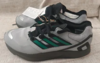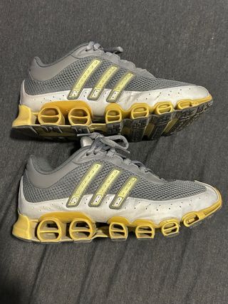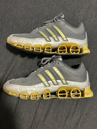 Zapatillas Adidas Megaride A3 Bounce. Unisex, talla 42 2/3 (9 US/8.5 UK/27cm), parte superior de malla gris transpirable con refuerzos de piel sintética plateada (metalizada), mediasuelas en TPU dorado (metalizado), suelas de goma negra en forma de acordeón, cordones cilíndricos gris. Una reproducción exacta del modelo del 2000 (Y2K) para running con estilo. Usadas excelente estado, entrego en Valencia centro, hago envíos.