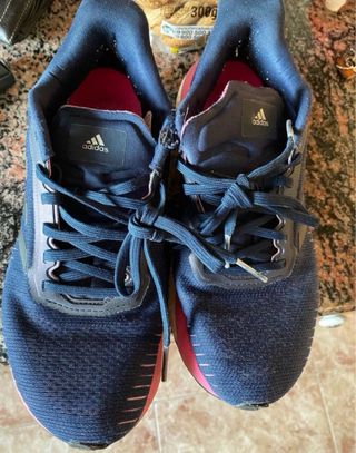 Zapatillas deportivas Adidas Ultraboost en talla 45. Combinan tonos azules y rojos. Talla 44 2/3 Bastante usadas pero bien conservadas, con las plantillas.