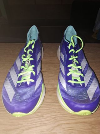 Zapatillas de running Adidas Adizero Takumi Sen 10. - Color morado y verde lima. - Talla 42 2/3 (equivalente a 42.5). - Diseño ligero y transpirable.