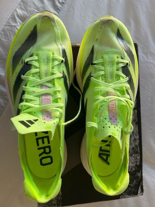 Zapatillas de running Adidas Adizero Adios Pro 3 totalmente nuevas, conservan etiquetas y caja. Talla 42, las vendo porque me van pequeñas. Fueron un regalo y no puedo devolverlas por perder el ticket. Originales. Diseñadas para ofrecer máximo rendimiento. - Parte superior de malla transpirable. - Mediasuela con tecnología Lightstrike Pro. - Suela de goma para un agarre óptimo.