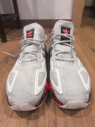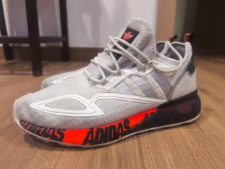 Zapatillas deportivas Adidas ZX 2K Boost con un diseño moderno y llamativo. - Combinación de colores naranja y blanco. - Estilo urbano y deportivo. Talla EUR 43 1/3 US 9 1/2