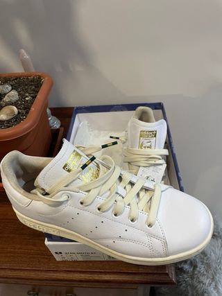 Zapatillas Adidas Stan Smith en color blanco con detalles dorados. Un clásico reinventado. - Exterior de cuero. - Cierre de cordones. - Suela de goma. Talla 36 2/3 casi un 37, yo calzo 36 y me quedan algo grandes, ese es el motivo de la venta, solamente me las he puesto una vez, como nuevas ya un precio inmejorable.