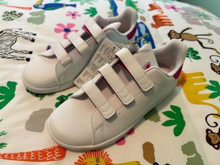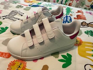 Zapatillas deportivas Adidas Stan Smith en talla 35, a estrenar. - Cierre de velcro. - Detalle en color rosa fucsia. - Diseño clásico.
