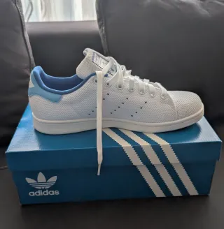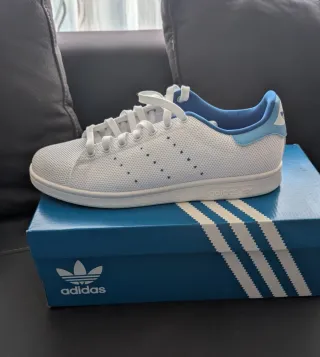 Zapatillas Adidas Stan Smith con un diseño moderno y cómodo. Talla 40 2/3 - Exterior de malla transpirable. - Detalle de color azul en el talón y la lengüeta. - Cierre con cordones blancos. - Suela de goma. - Icónico logo de Stan Smith en la lengüeta.