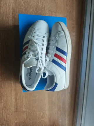 Zapatillas Adidas modelo coast Star casi identicas a laStan Smith con el diseño clásico de tres rayas. - Rayas en color azul y rojo. - Parte superior blanca. Puestas en 3 ocasiones.