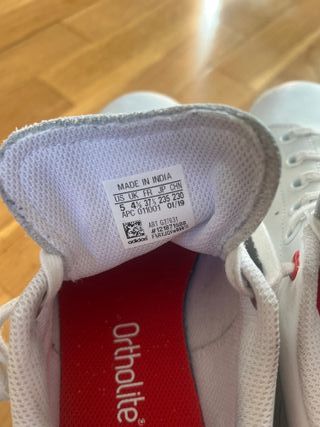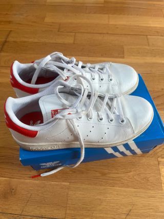 Zapatillas Adidas Stan Smith en talla 37 1/3 - Diseño clásico en blanco y rojo. - Detalles del modelo en la etiqueta de la caja - Puestas un par de veces. - Se venden por no usar