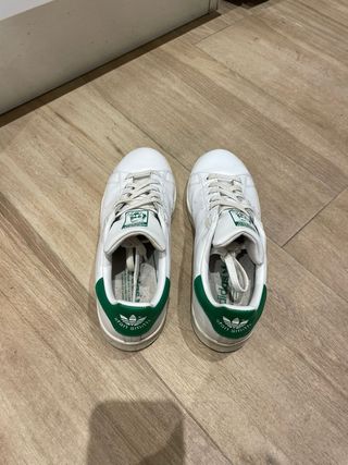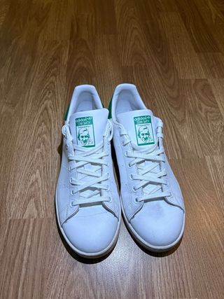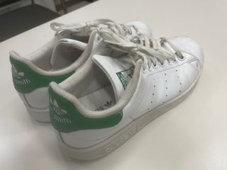 Zapatillas Adidas Stan Smith en color blanco con detalles verdes. Talla 36 2/3 (ESP/FR). Poco uso, bien conservadas. Si le cambias los cordones parecerán casi nuevas