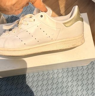 Zapatillas Adidas Stan Smith con detalles dorados. Un clásico reinventado. - Exterior de cuero blanco. - Detalle del talón en dorado. - Cierre de cordones. -Puntera izquierda rozada la piel.