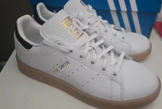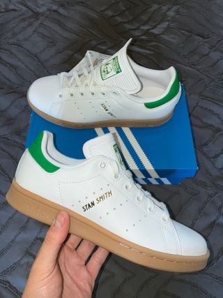 Zapatillas Adidas Stan Smith en talla 38.5, nuevas con etiquetas. - Diseño icónico, detalles en dorado - Suela de goma marrón. - Cierre con cordones blancos.