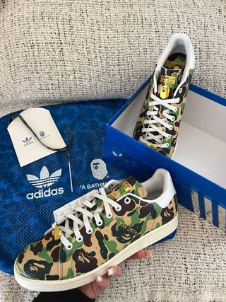 Zapatillas Adidas Stan Smith edición especial BAPE con estampado de camuflaje. Talla 44,5 EUR / 10,5 US Nuevas a estrenar. En caja original, funda guardapolvo y cordones extra.