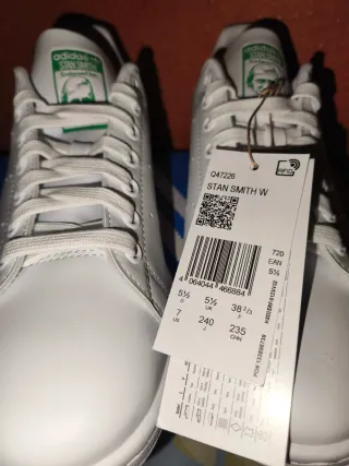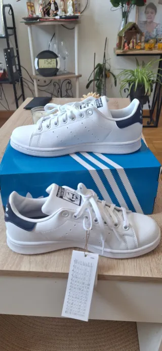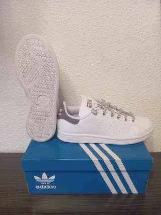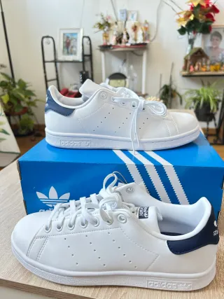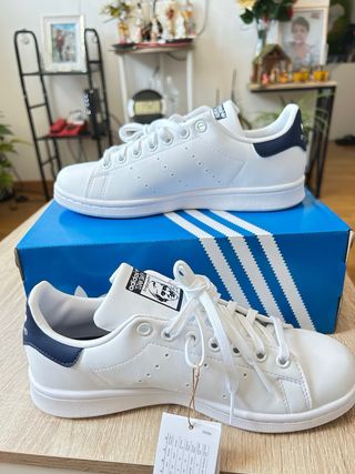Zapatillas Adidas Stan Smith en talla 38. Nuevas y originales con sus etiquetas. - Diseño icónico Stan Smith. - Suela de goma. - Cierre con cordones.