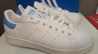 Zapatillas Adidas Stan Smith en talla 37. - Diseño clásico en blanco con detalles en azul. - Logo de Adidas y Stan Smith. - Suela de goma.