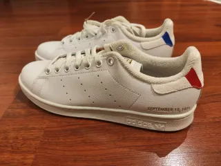 Edición limitada de zapatillas Adidas Stan Smith con detalles en rojo y azul en el talón. La fecha SEPTEMBER 15, 1971 está grabada en el lateral.