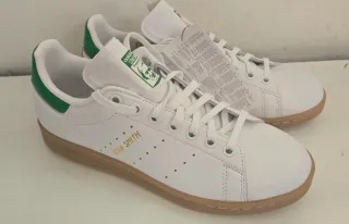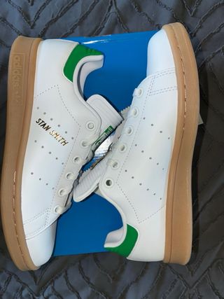 Zapatillas Adidas Stan Smith en talla 38, a estrenar. - Diseño clásico con detalles en verde. - Cierre de cordones. - Parte superior de piel sintética.