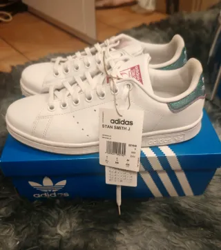Zapatillas deportivas Adidas Stan Smith en color blanco con detalles rosas y parte de atrás con brillantina. Son talla 38 y tallan normal. Usadas solo un par de veces, se encuentran en muy buen estado. Vienen con su etiqueta y caja original. Acepto envíos: rápido y bien empaquetado. Si estás interesadx o tienes alguna pregunta no dudes en escribirme 😊