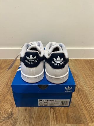 Zapatillas deportivas Adidas Stan Smith J en color blanco con detalles en azul marino. - Modelo: Stan Smith J - Talla: 38.5 EUR (245 JPN / 5.5 UK / 5.5 US) - Color: Blanco con azul marino - Cierre: Cordones