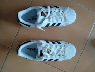 Clásicas zapatillas Adidas Superstar con un diseño icónico. - Parte superior de cuero sintético. - Tres rayas laterales en contraste. - Cierre con cordones. - Suela de goma. - Detalle de la marca en la lengüeta y el talón. Me las regalaron y me quedan grandes por eso las vendo.