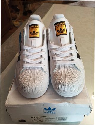 Bambas zapatillas adidas blancas superstar originales de piel. Con cordones y suela Superstar. Muy cómodas talla 45.5. Solo puestas una vez. Precio en tienda 180e