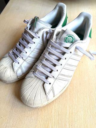 Zapatillas deportivas Adidas Superstar con un diseño clásico y llamativo. - Combinación de colores blanco y verde. - Detalle de las icónicas tres rayas. - Logo Superstar en dorado. Vendo Adidas Superstar con muy poco uso y en buen estado. Edición limitada.