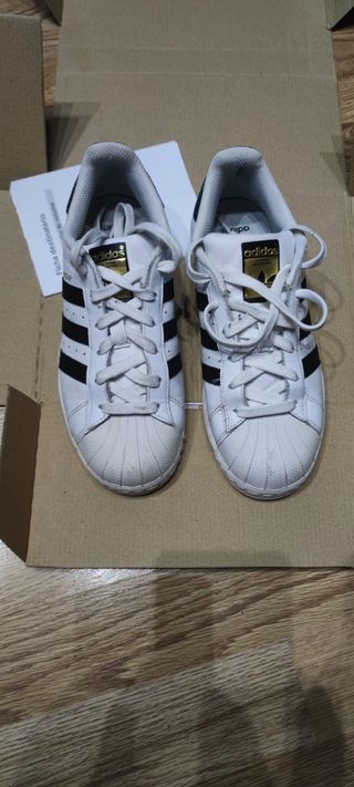 Vendo un par de zapatillas Adidas Superstar. Son blancas con detalles negros. Están en buen estado, aunque presentan señales normales de uso. - Modelo Superstar - Talla (especificar talla) - Ideales para uso diario