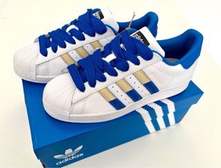 Zapatillas Adidas Superstar, talla 42, en colores azul y blanco. Están en muy buen estado, parecen prácticamente nuevas. - Cuero blanco impecable. - Detalles en azul y rojo. - Ideales para coleccionistas. Modelo SUPERSTAR procedente de muestrario del año 2002 en perfecto estado. se han usado en dos ocasiones. estan perfectas. No guardo su caja original