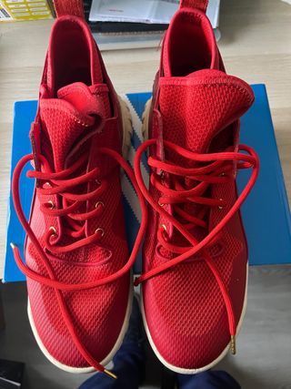 Vendo zapatillas Adidas Tubular Runner. Son de color rojo y tienen un diseño tejido. Están en buen estado.