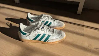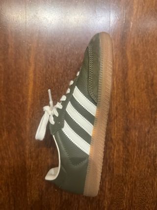 Clásicas zapatillas Adidas Samba en color blanco con detalles en verde. - Diseño icónico de Adidas. - Tiras laterales en verde. - Suela de goma. - Detalle SAMBA en el lateral. Vendo por no uso, están prácticamente nuevas.