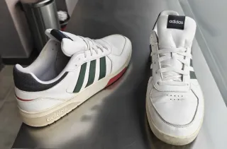 Vendo zapatillas Adidas originales de perfil bajo. Combinación clásica en blanco con las tres rayas en verde oscuro y suela con detalle en rojo/granate. Talla: 46 (Etiquetado oficial). Nota importante sobre el ajuste: El modelo viste algo estrecho. Las vendo precisamente porque me quedan un pelín pequeñas; las recomendaría más para alguien que use habitualmente una talla 45. Estado: Usadas muy poco. La suela y el interior están en perfecto estado (ver fotos). Entrega: Exclusivamente en mano en Poblenou (Barcelona).