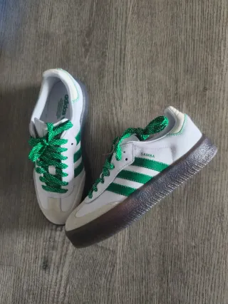 Están nuevas con etiqueta. Ideal para regalo 🎁 ✨ Adidas Sambae W originales, modelo con plataforma y suela translúcida efecto goma. Color blanco con detalles en verde y cordones verdes brillantes que les dan un toque diferente 💚 recambio cordones blancos incluidos. ✔️ Talla 38 2/3 (EU) – 5,5 UK – 7 US ✔️ Referencia: IE9105 ✔️ Con caja original Modelo icónico estilo retro, súper combinable y muy cómodas. 📦 Envío rápido