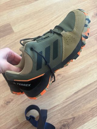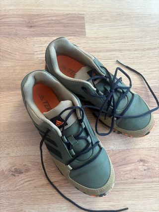 Zapatillas deportivas Adidas Terrex en tonos verdes y beige. - Diseño para senderismo y actividades al aire libre. - Cierre con cordones. - Suela con buen agarre.