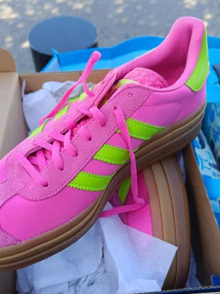 Zapatillas Adidas Gazelle Bold en llamativos tonos rosa fucsia y verde lima. Un diseño vibrante y moderno. - Modelo Gazelle Bold. - Combinación de colores rosa fucsia y verde lima. - Talla 40. suela de plataforma triple que estiliza muchísimo. El color es un rosa fucsia eléctrico con las míticas tres rayas en un verde lima neón muy llamativo. Talla: 40 EUR (8 US / 6.5 UK / 250 JP). Color: Lucid Pink / Semi Lucid Lime / Gum.
