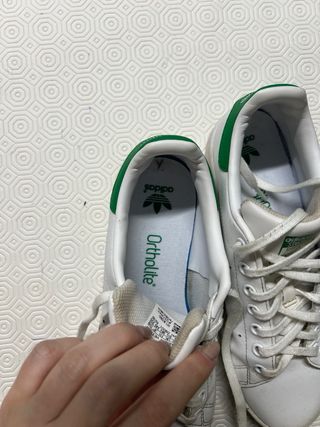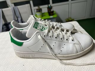 Zapatillas Adidas Stan Smith clásicas en blanco con detalles verdes. - Diseño icónico. - Cierre con cordones. - Logo de Stan Smith en la lengüeta.
