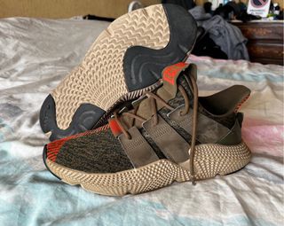 Zapatillas Adidas Prophere con un diseño llamativo. Modelo: adidas Prophere. Color oficial: Trace Olive / Trace Olive / Solar Red. Características: Presenta una parte superior de tejido de punto con detalles bordados en la puntera y las emblemáticas 3 bandas laterales en nobuk. Su diseño se describe como moderno, audaz y cómodo para el uso diario. Muy cuidadas, como muestran las fotos.