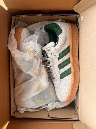 Zapatillas Adidas Samba sin estrenar. - Color beige con detalles en verde. - Suela de goma marrón. - Talla 42.