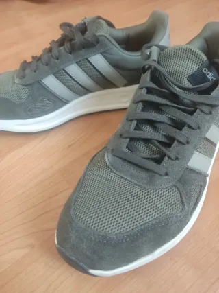 Zapatillas deportivas Adidas en tonos grises y verdes. - Diseño con las tres rayas características de la marca. - Combinación de malla y ante. - Suela blanca.
