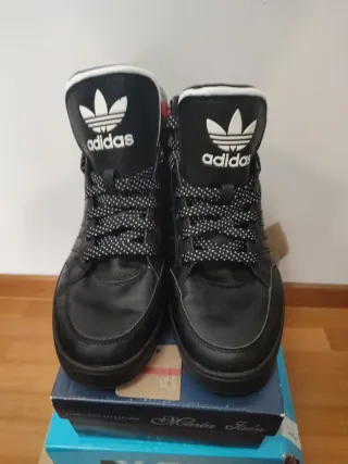 Zapatillas altas de la marca Adidas con un diseño moderno. - Talla 43 1/3 - Solo se han usado 1 vez, estan nuevas - Detalle de tres rayas laterales. - Logo de Adidas en la lengüeta. - Tira lateral con estampado de logos y detalle en rojo.