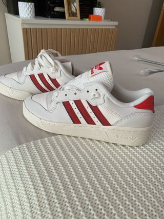 Zapatillas deportivas de la marca Adidas con un diseño clásico. - Combinación de colores blanco y rojo. - Detalle de las tres rayas icónicas de Adidas.