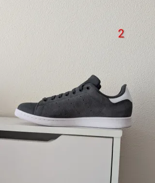 Zapatillas Adidas Stan Smith en talla 44. Diseño clásico color carbón con detalles en blanco. Nuevas sin estrenar. - Parte superior de ante. - Suela de goma. - Detalle de las tres rayas perforadas.