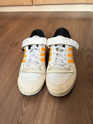 Vendo zapatillas Adidas Forum 84 en blanco y naranja. Están en buen estado, aunque presentan algunas pequeñas manchas tras un par de usos. - Modelo Adidas Forum 84 - Cierre de velcro y cordones - Suela de goma