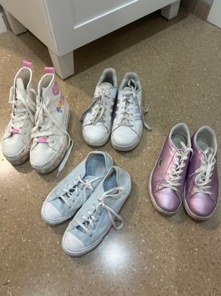 Vendo cuatro pares de zapatillas por 20€ en buen estado. Son ideales para cualquier ocasión. Las vendo realmente por las lacoste que están en perfecto estado, el resto van en el pack. Algunas con meterlas en la lavadora quedan como nuevas. - Incluyen un par de zapatillas Adidas blancas con detalles morados, un par de zapatillas Converse azules, un par de zapatillas Lacoste rosas y unas zapatillas altas de Care Bears blancas con detalles rosas. - Las zapatillas están ligeramente usadas pero en buen estado.