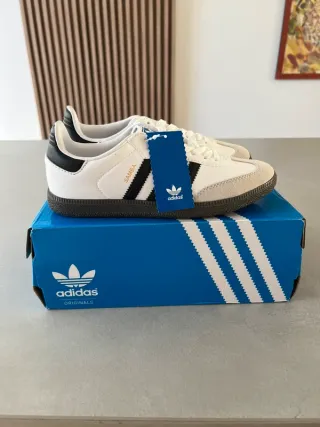 Zapatillas Adidas Samba OG en talla 43. Perfectas para el día a día. - Diseño clásico con detalles en gamuza. - Tres rayas laterales icónicas. - Suela de goma. - Cierre de cordones.