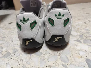 Zapatillas deportivas Adidas con un diseño moderno y llamativo. Un poco rizadas delante. Por lo demás están bien. - Combinación de blanco y verde. - Detalle de las tres rayas características de la marca.