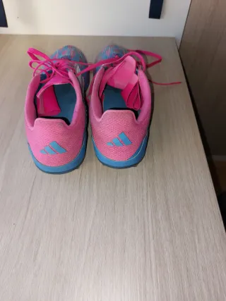 Zapatillas deportivas Adidas con un diseño moderno y llamativo. - Combinación de colores blanco, azul y rosa. - Cordones blancos con detalles en rosa. - Suela gruesa con degradado azul y rosa. No tienen plantilla. Se ha sacado para colocar otra. Sin apenas uso. Un par de ocasiones.